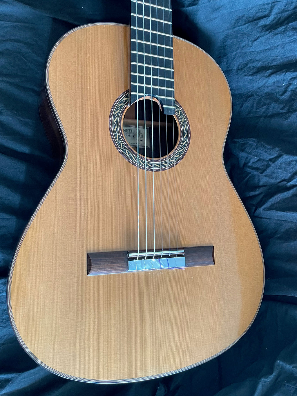 An excellent one-owner example of Kenny Hill’s top-of-the-line guitar in excellent original condition. The guitar has excellent provenance, having been owned by Julian Byzantine. The guitar is mellow but clear with great dynamic range and ships in a Humicase.